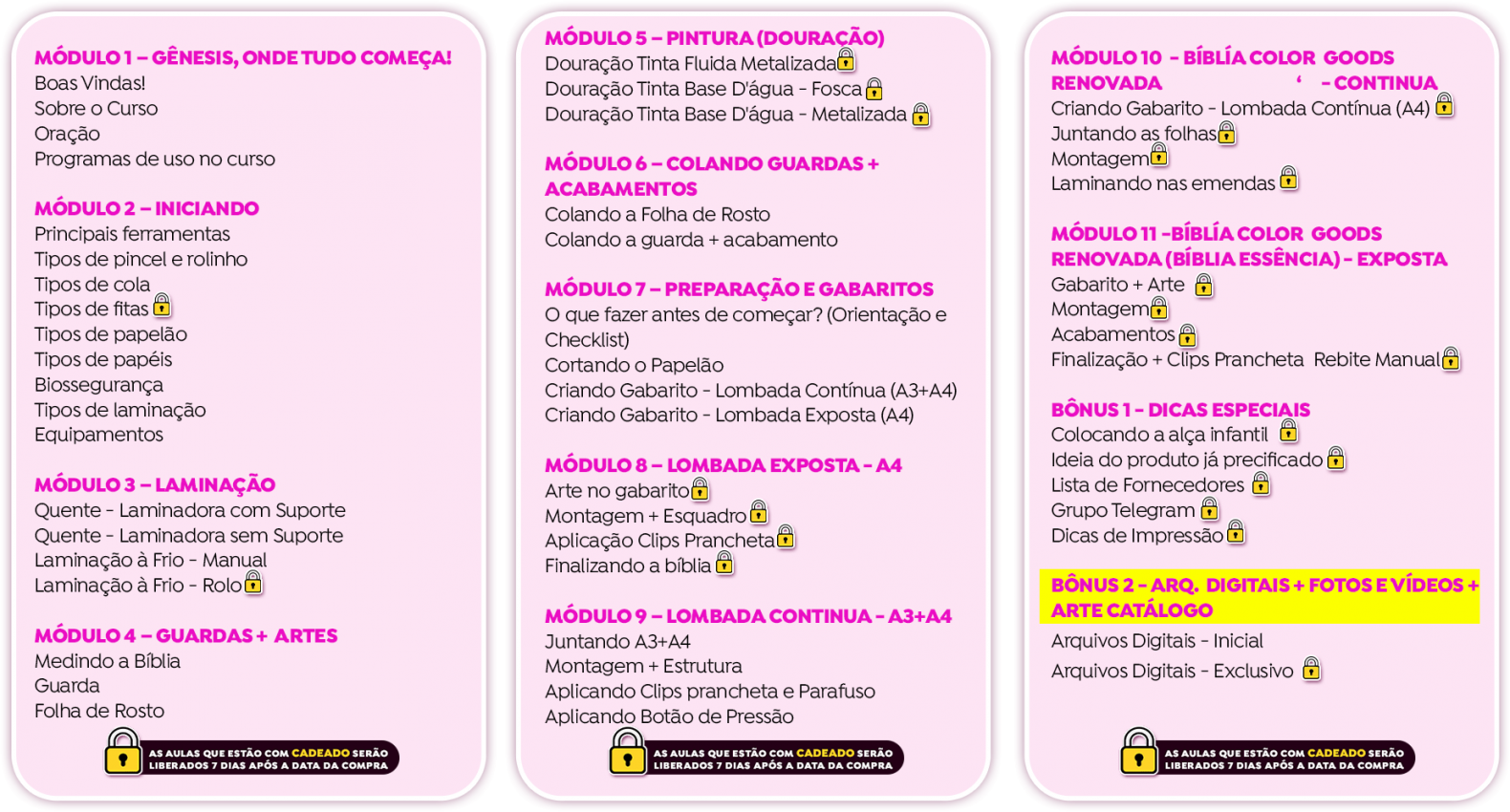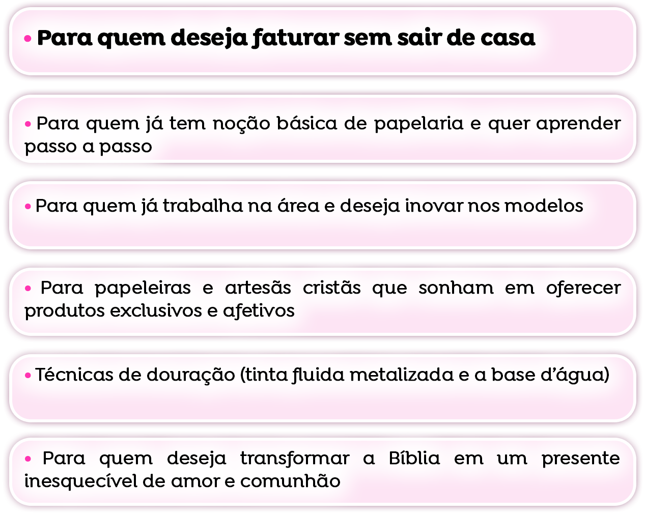 💡 A boa notícia é que 1 ano é mais que suficiente para você assistir todas as aulas, praticar as técnicas, produzir suas Bíblias e começar a faturar com o conhecimento adquirido.